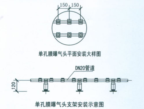 5、曝氣管網(wǎng)在設(shè)計過程中必須按照0.5-0.8米左右的距離考慮安裝可調(diào)節(jié)固定支架。
