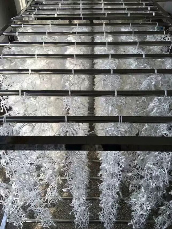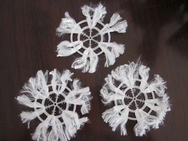 組合填料是在軟性填料和半軟性填料的基礎(chǔ)上發(fā)展而成的,它兼有兩者的優(yōu)點。其結(jié)構(gòu)是將塑料圓片壓扣改成雙圈大塑料環(huán),將醛化纖維或滌綸絲壓在環(huán)的環(huán)圈上,使纖維束均勻分布;內(nèi)圈是雪花狀塑料枝條,既能掛膜,又能有效切割氣泡,提高氧的轉(zhuǎn)移速率和利用率。使水氣生物膜得到充分交換,使水中的有機(jī)物得到高效處理。